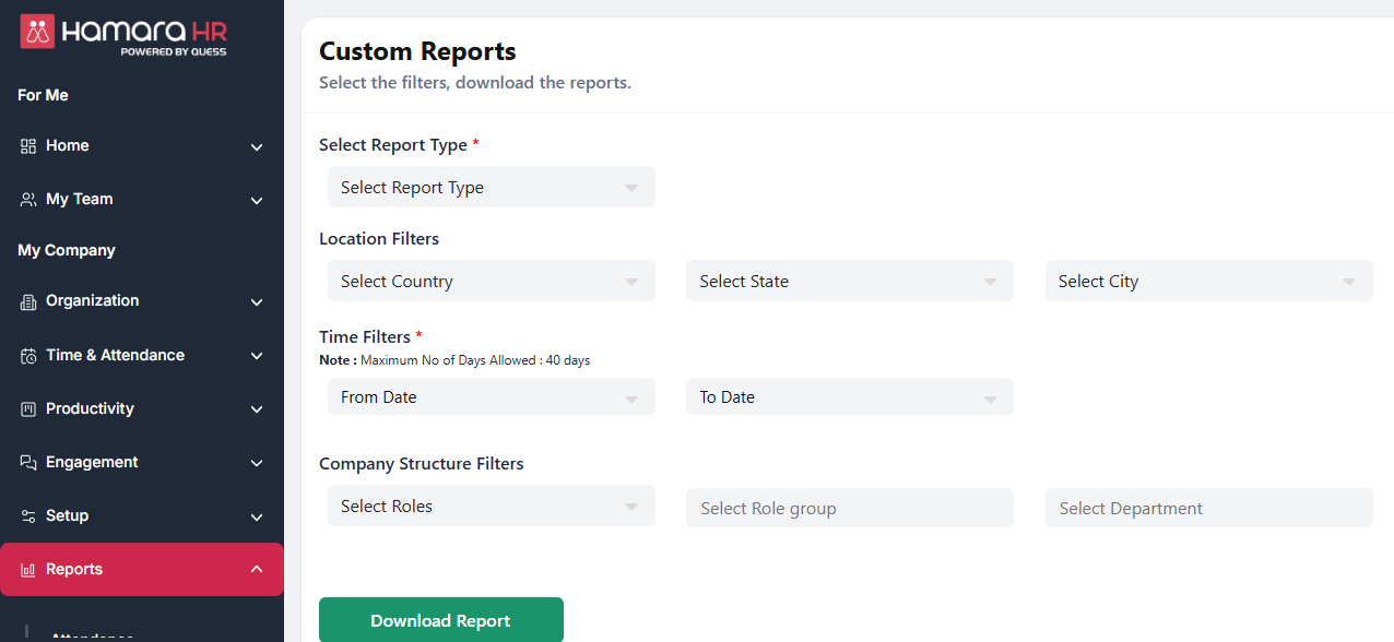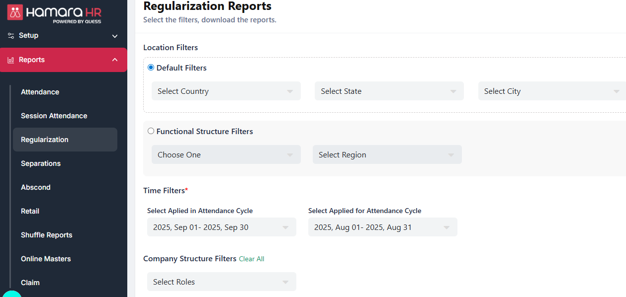 Ans: Yes, customer admin can download the regularization approval report from the Reports -> Custom --> Select the report type as "Regularization Approval/ Awaiting Report"