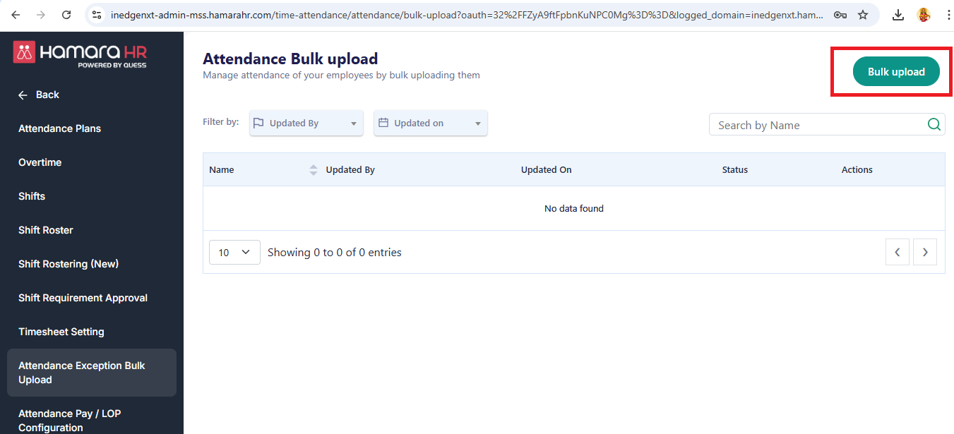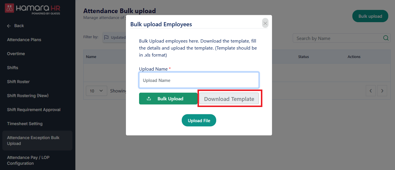 Go to, Admin -> Time & Attendance -> Attendance -> Attendance Exception Bulk Upload -> Bulk Upload (Top Right Corner) -> Download Template -> Fill the template -> Bulk Upload