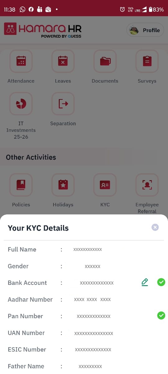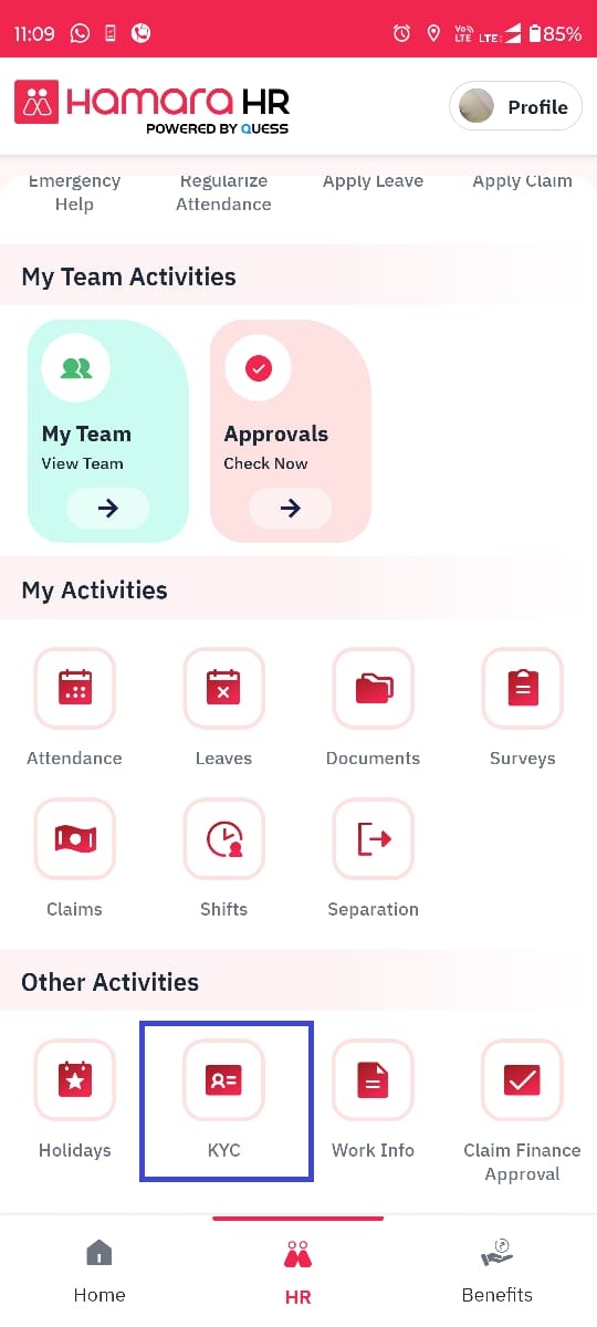 Mobile App → HR Tab → Other Activities → KYC