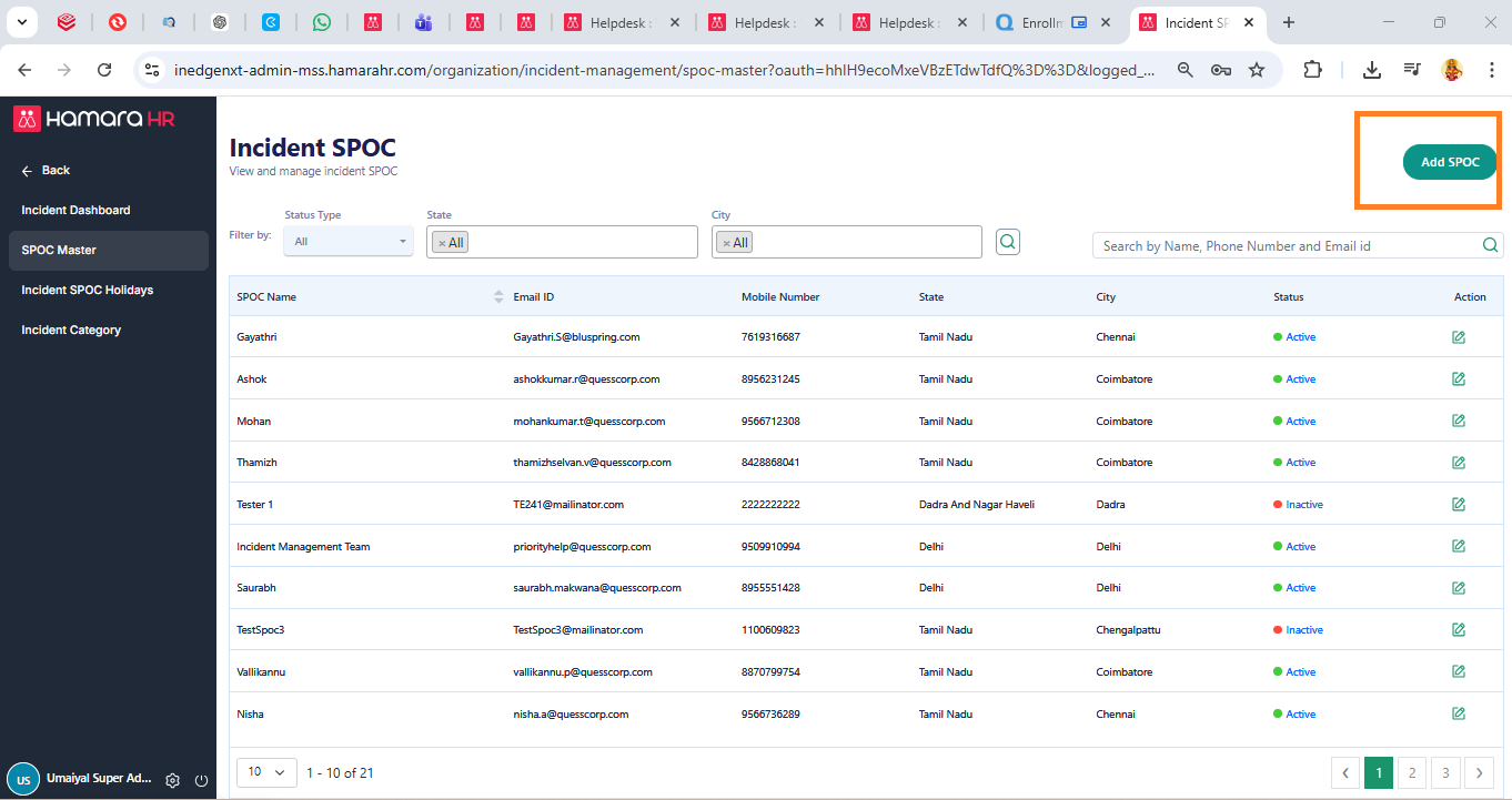 Super Admin → Organization → Incident Management → SPOC Master → Add a SPOC