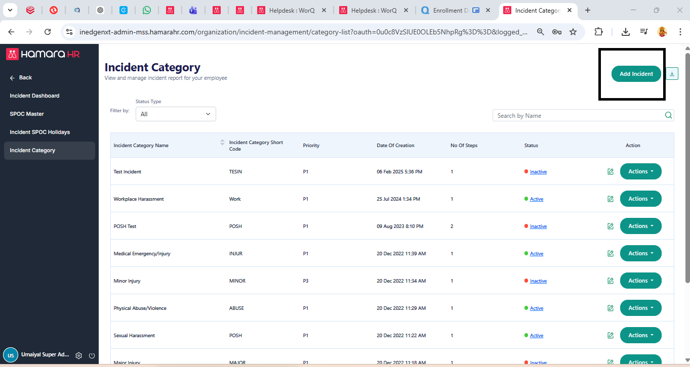 Super Admin → Organization → Incident Management → Incident Category → Add Incident